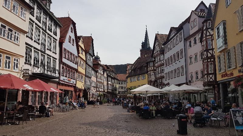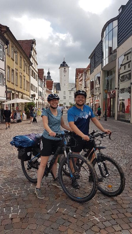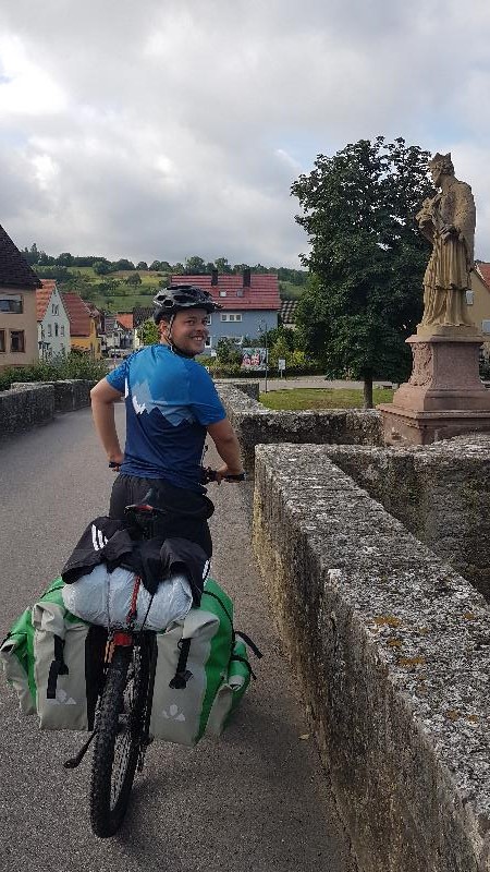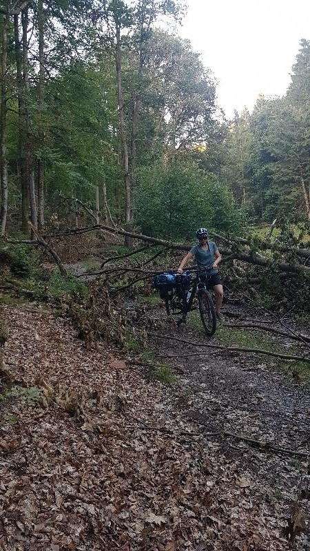 Ersten 2/3 der Tagesetappe entlang dem Taubertal flussabwärts. Schöne Landschaft. Ab dem Main gings in den Spessart. Hier erfolgt ein 15km langer Anstieg (moderate Steigung). Ab der Autobahnraststätte gings auf der vielbefahrenen Landstraße und Radweg bergab nach Aschaffenburg. Hatten uns nach kurzer Zeit für einen Umweg durch den Wald abseits der Straße entschieden. Aufgrund von auf weiter Strecke umgefallenen Bäume hatten wir eine sehr schweißtreibende Zeit mit den Rädern und Taschen im Wald zwischen den Bäumen.